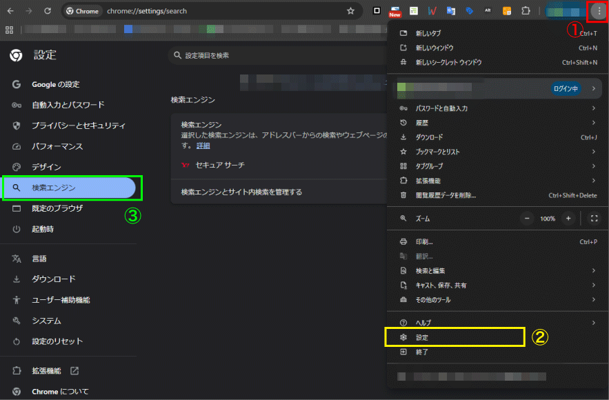 下図のように右上の設定マークから、①~③の手順で検索エンジンの設定画面を開きます。