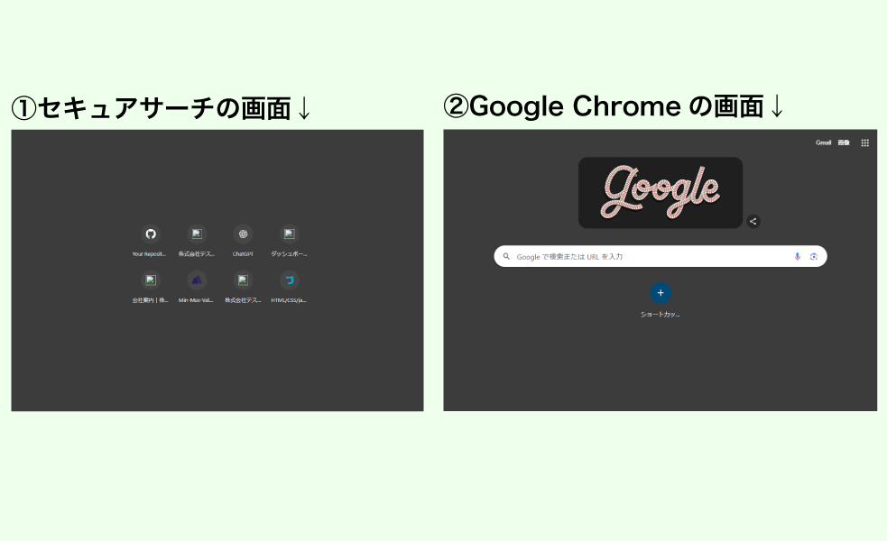 下図のように、セキュアサーチはショートカットアイコンのみが並んで表示、Googleの場合は、ショートカットアイコンと、キーワード検索、ロゴが表示されます。これが表示されていない場合は①のセキュアサーチの状態になります。