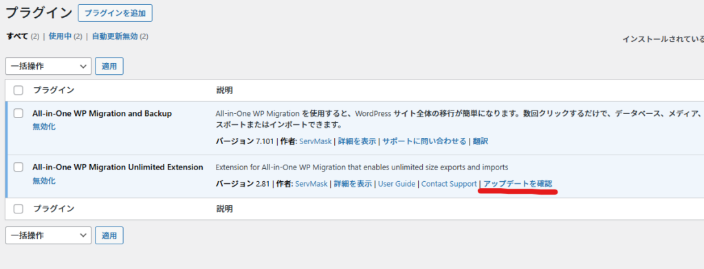 All-in-One WP Migration Unlimited Extensionプラグインを更新する際、他のプラグインと同様に更新ボタンが表示されない場合があります。